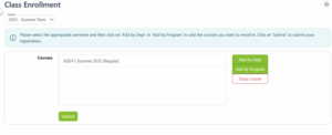 Click the Main menu option of Enrollment & Schedule submenu Class Enrollment. Ensure the drop-down menu has the term you wish to enroll in. Select the term from the drop-down menu as necessary. Next, click Add By Dept.